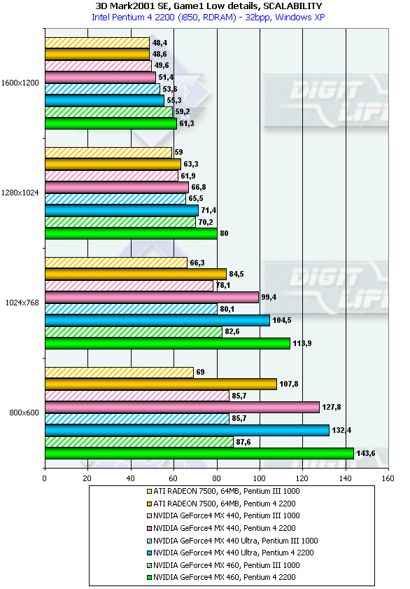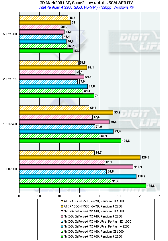 Этот тест нам продемонстрировал, что GeForce4 MX 460 является по сути лидером. Даже GeForce3 Ti 200 немного отстал. Хотя надо иметь в виду высокую процессорозависимость Game1, особенно в 800х600 и 1024х768. Что и видно на второй диаграмме.