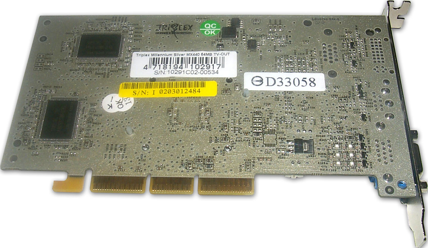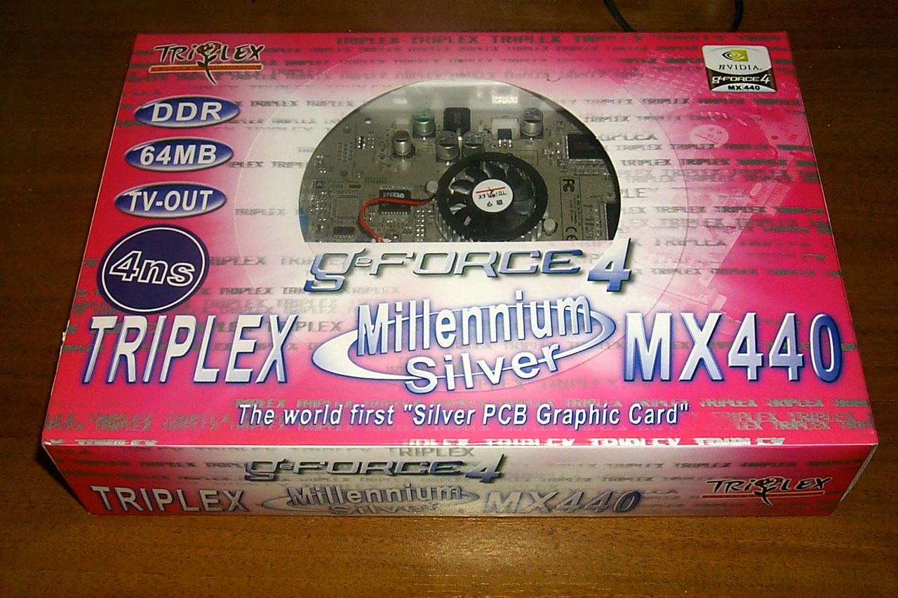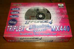 - Triplex Millennium Silver GeForce4 MX 440 на сегодня это самая редко встречающаяся на рынке карта, как и вся продукция от Triplex. По сути карты могу сказать, что это рядовой продукт, хоть и с посеребрением. Отрадно, что наличие хоть и тонкого, но слоя драгметалла не сказалось на цене, и стоимость такой карты не превышает среднюю на МХ 440 (около $100 на конец мая).