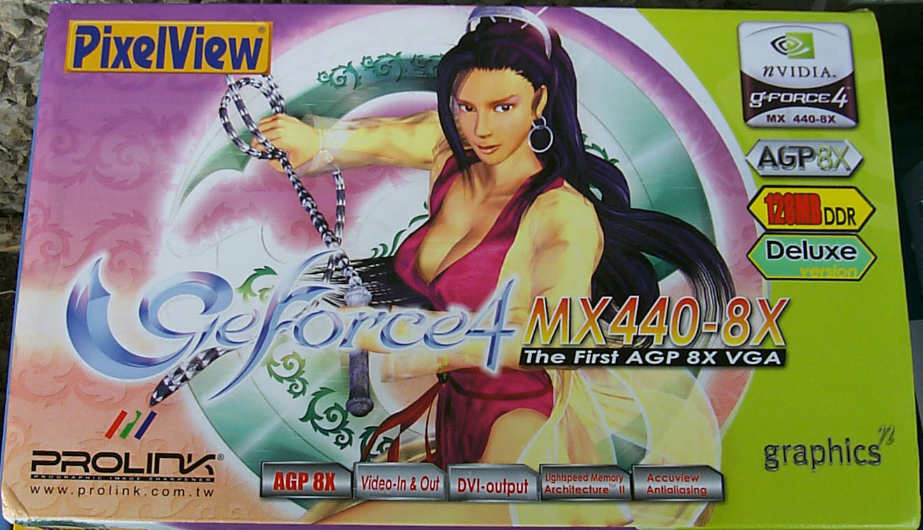- Prolink PixelView GeForce4 MX440-8x Эта карта интересна тем, что поддерживает Video-In (разумеется, Video-Out тоже в комплекте :-). Плата имеет практически самую низкую цену из MX440-8x, при этом кроме VIVO, у нее имеется 128 мегабайт памяти (хотя и подчас бесполезных пока), а также хоть и более бедный, но все же приличный комплект ПО. По этим всем параметрам плата на нашем рынке может получить неплохую популярность.