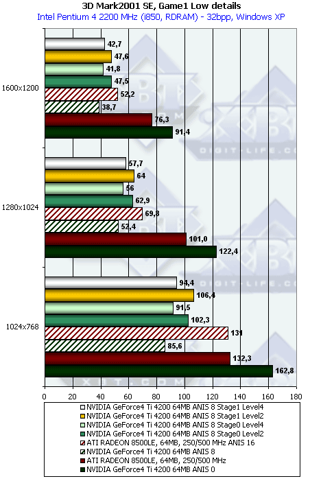 - 3DMark2001 SE Pro (MadOnion/Remedy), Game2 "Dragothic" DirectX 8.0, Hardware TCL, мультитекстурирование, LOW Details, DXTC OFF, двойная буферизация, 24-битный Z-буфер