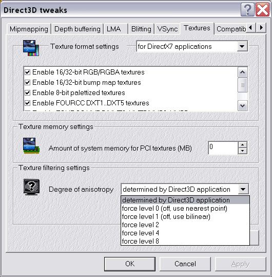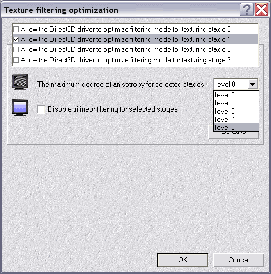 И вот, в последней версии этой программы появилась возможность не только включать анизотропию, но и настраивать ее, выбирая компромисс между скоростью и качеством. Честно скажу, что такой гибкости в настройке работы этой функции больше ни у кого нет. Разумеется, это все работает только на драйверах версии 30.00 и выше. Вероятно, в отделе ПО у NVIDIA идет отладка включения "быстрой" анизотропии в будущих NV28/NV18. Но знающим людям это доступно уже и сейчас :-).