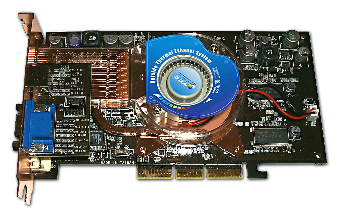 Сразу в глаза бросается очень необычный дизайн платы ABIT Siluro GF4 Ti4200 OTES. Хотя сама PCB, за некоторыми исключениями, базируется на эталонном дизайне. Лишь то место, где у обычной карты расположено гнездо VGA, занято трубчатым радиатором.