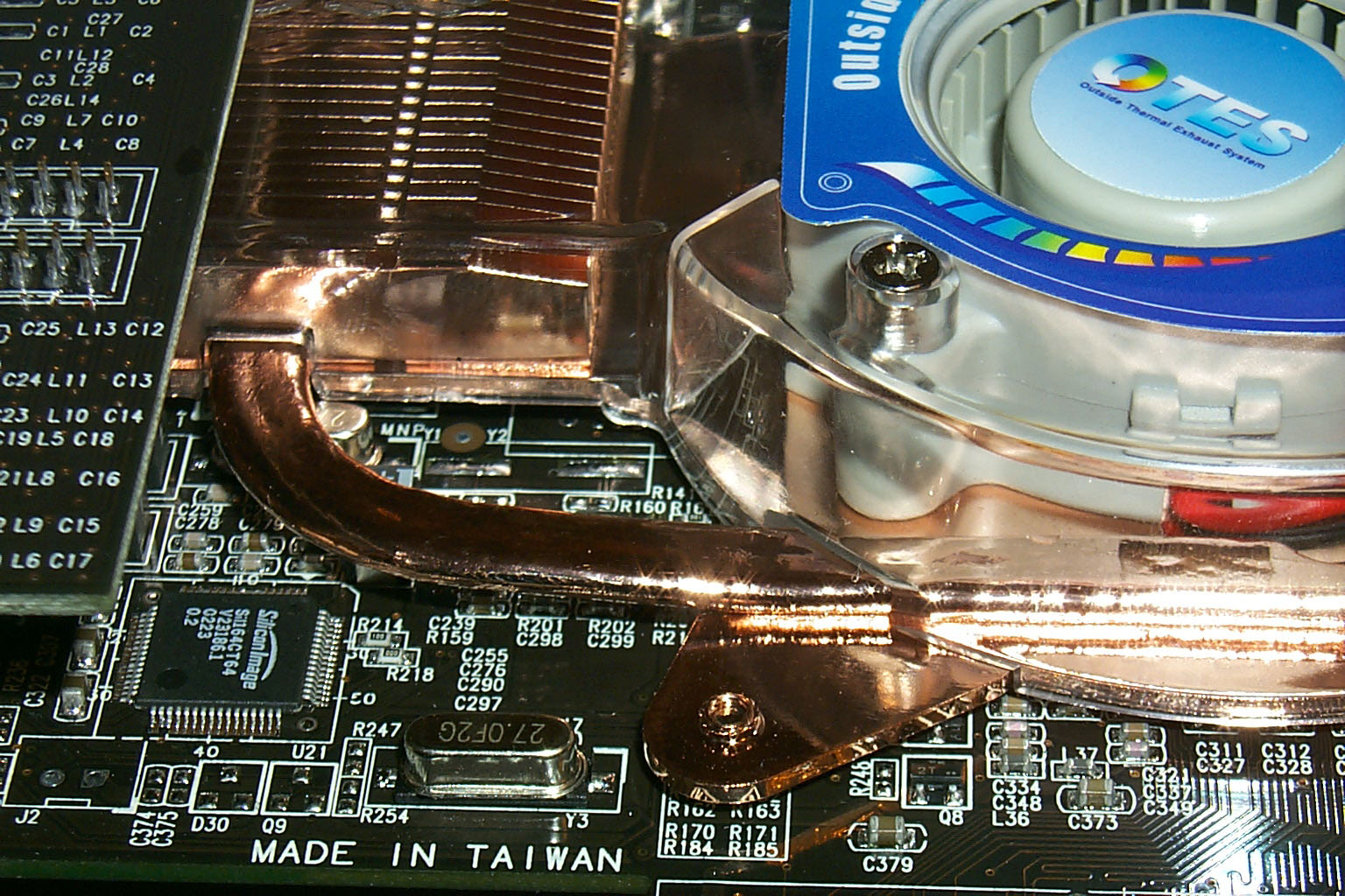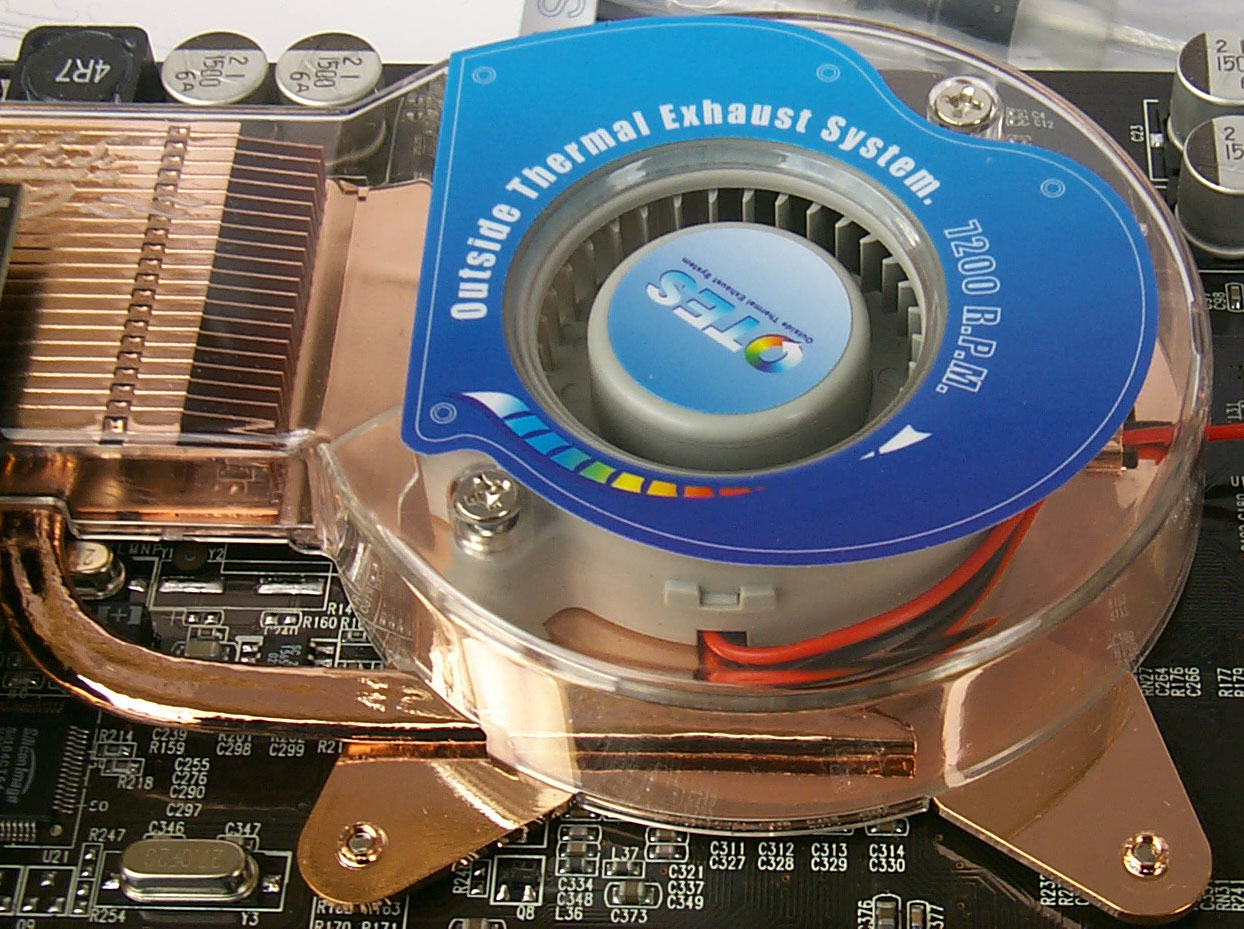 Таким образом, создана система охлаждения, находящаяся не над чипом, как у всех общепринятых схем, а в стороне от него. При этом мощный поток воздуха выносит тепло за пределы системного блока,"выхлоп" идет в нижней части брэкета через соответствующее отверстие. Кстати, название OTES это и означает: Outside Thermal Exhaust System система охлаждения при помощи вывода тепла наружу.