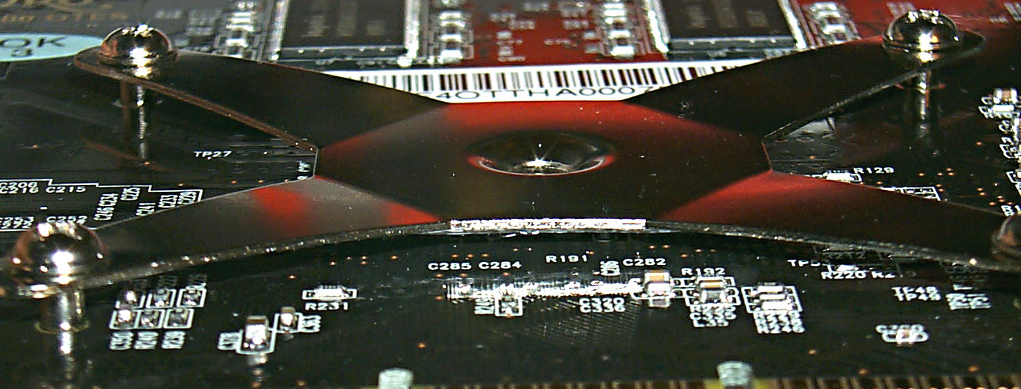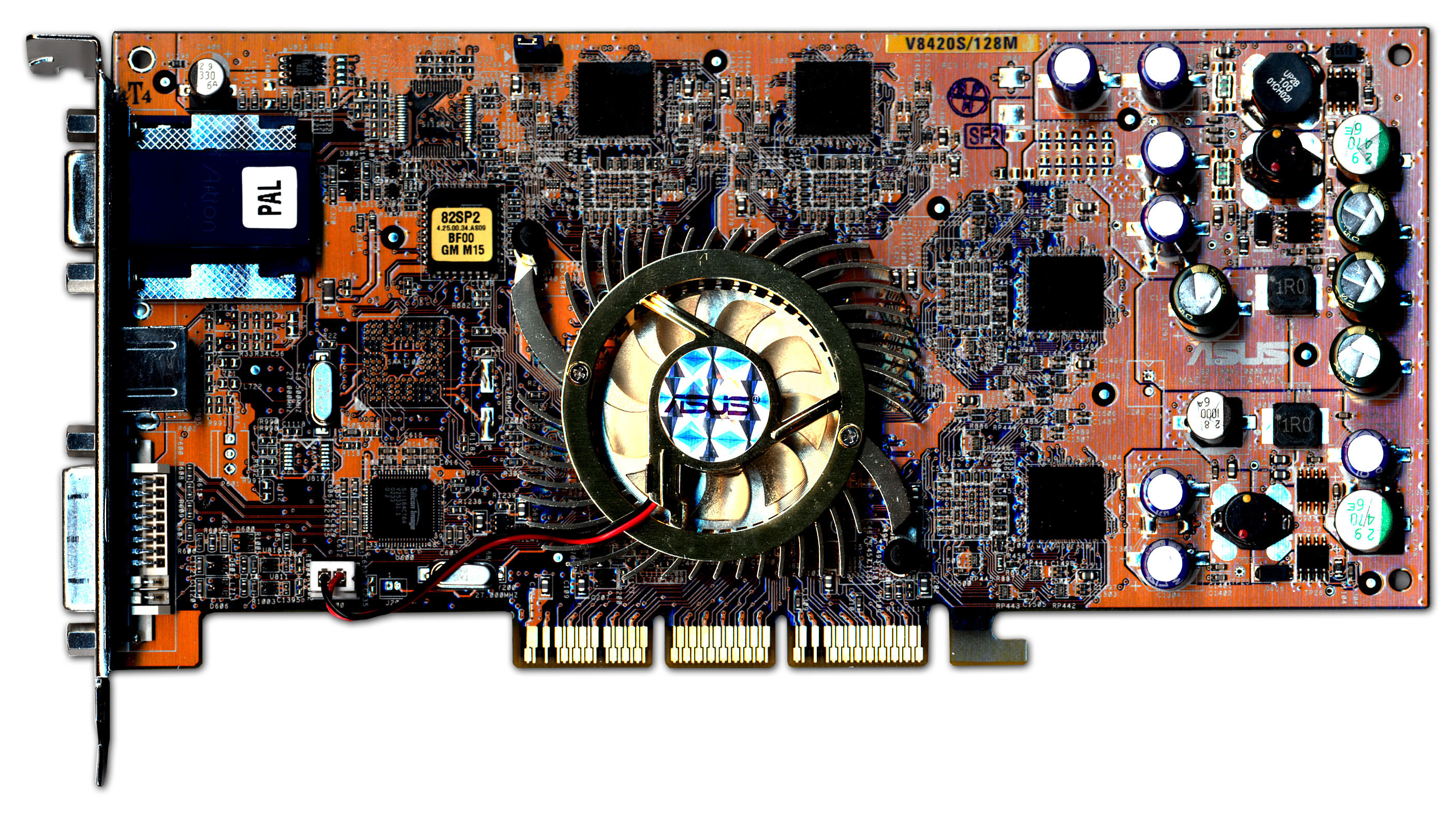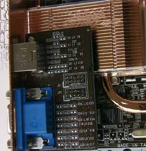 Что касается карты от ASUS, то мы видим, что она базируется на PCB от Ti 4600 и отличается от ранее выпущенных карт ASUS только насыщенным желтым цветом. Напомню, что такие платы изготавливаются в 8-слойном дизайне, что дает высокую устойчивость при работе на относительно высоких частотах.