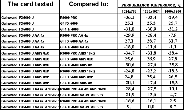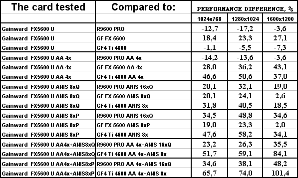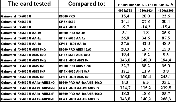 Gainward FX PowerPack Ultra/760 XP Golden Sample может дать пользователю:- более высокую скорость в АА и/ или анизотропии, нежели соперники (RADEON 9600 PRO или GF4Ti 4600);