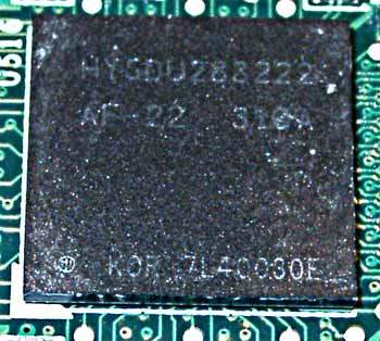 | Микросхемы памяти производства Hynix. Время выборки у микросхем памяти 2.2ns, что соответствует частоте работы примерно 454 (908) МГц, память же работает на частоте 400 (800) МГц. Частота работы GPU 400 MHz (это выше старой ревизии на 50 МГц). Интерфейс обмена с памятью 128 бит. | ![]() |