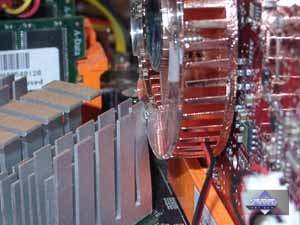 - Дизайн карты от MSI немного отличается от эталонного у 5900 Ultra, вся правая часть, отвечающая за питание карты, переработана. Есть сведения, что вышел новой эталонный дизайн от NVIDIA с укороченной PCB и заменой элементов. Вероятно, на нем и базируется карта от MSI. В целом длина карты стала равна длине GF4 Ti 4600 (NV25):