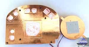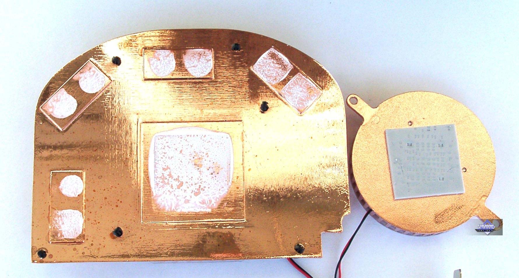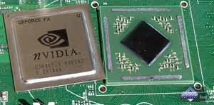Как мы видим, маркировка уже серийная, чип был произведен на 19-й неделе 2003 года (это примерно начало мая). Упаковка FlipChip, сверху кристалл закрыт защитной крышкой. Мы не так давно снимали крышку у NV30 (FX 5800), поэтому можем показать, как оно выглядит внутри: