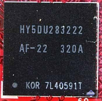 | Микросхемы памяти производства Hynix. Время выборки у микросхем памяти 2.2ns, что соответствует частоте работы примерно 454 (908) МГц, память же работает на частоте 425 (850) МГц. Частота работы GPU 400 MHz. Интерфейс обмена с памятью — 256 бит. | ![]() |