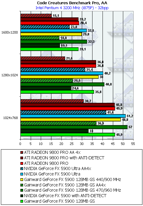 Здесь мы имеем сказать следующее. Во-первых, определение «заточек» продемонстрировало, что NVIDIA в данном бенчмарке весьма серьезно подошла «к делу» и +30% скорости получились весьма блестяще. Во-вторых, без «заточек» FX 5900 проиграл вчистую (что, собственно, и следовало ожидать, ведь по скорости работы шейдеров все новинки NVIDIA не блещут, а Code Creatures очень активно использует шейдеры). К сожалению, в данной программе невозможно снять два одинаковых скриншота (это rolling demo, интерактивности нет), поэтому сравнить качество с «заточками и без» не получится. Но даже если и есть некие полезные оптимизации, помогающие поднять скорость при отсутствии падения качества, то имело бы смысл говорить об этом, если бы данное приложение было бы игрой. Но так как это целиком и полностью бенчмарк (пусть и на игровом движке), то осуществлять подмены и заставлять работать тест не так, как он задумывался авторами — некрасиво. К чести ATI надо сказать, что заточек под данный тест у RADEON-ов не обнаружено!