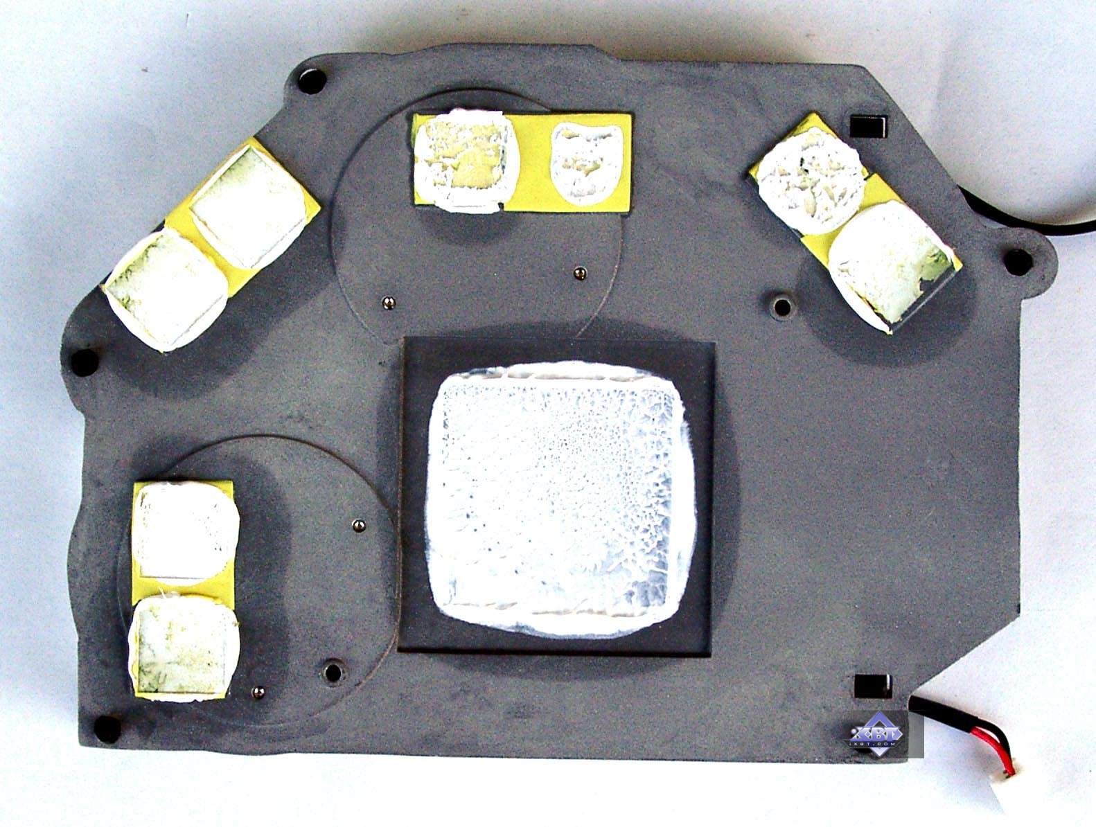 Как показали наши исследования, данная система охлаждения является очень эффективной, несмотря на единый радиатор для памяти и GPU. Впрочем, память греется очень мало (для 2.2ns памяти работа на частоте в 425 МГц является очень даже щадящей), тепловыделение NV35 значительно уменьшено, поэтому супер-сложные системы охлаждения не требуются.