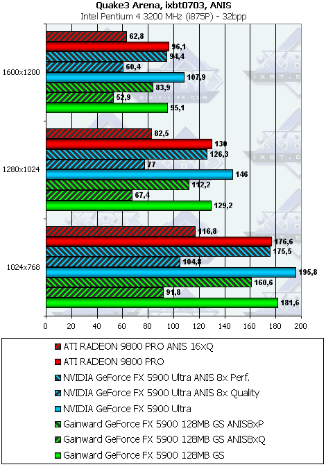 • Quake3 Arena v.1.17 (id Software/Activision) — OpenGL, мультитекстурирование, ixbt0703-demo, настройки тестирования все на максимальном уровне: уровень детализации — High, уровень детализации текстур — №4, S3TC OFF, плавность кривых поверхностей резко увеличена при помощи переменных r_subdivisions «1» и r_lodCurveError «30000» (подчеркну, что по умолчанию r_lodCurveError «250» !), конфигурации можно скачать тут