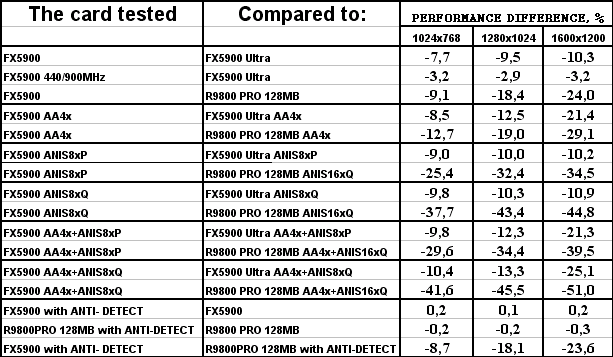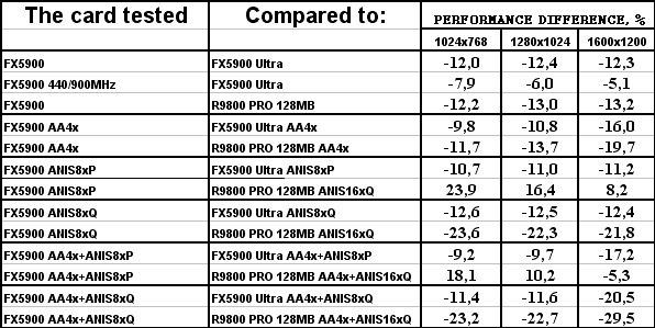 Прошу обратить самое пристальное внимание на работу FX 5900 с анизотропной фильтрацией в этом тесте! Как мы видим по отсутствию падения скорости, эта функция просто НЕ РАБОТАЕТ! Поэтому на прекрасные цифры обгона исследуемой картой соперника в лице RADEON 9800 PRO с тестах с анизотропией можно не смотреть. Хотя это не является прямым доказательством отсутствия анизотропии, но пока еще нигде бесплатной она не была.