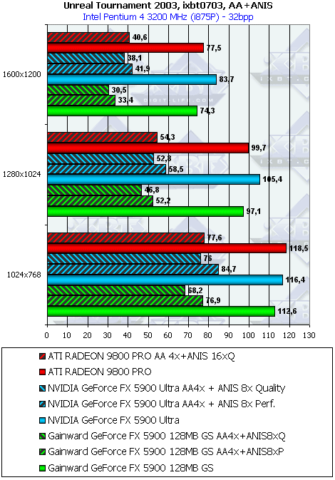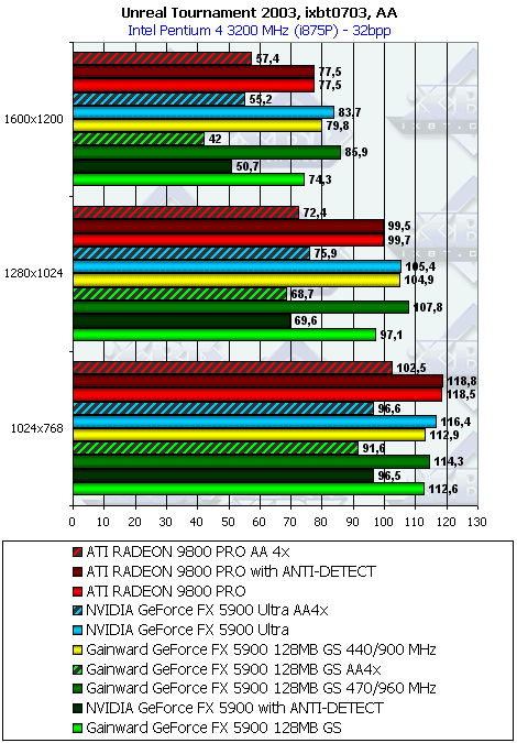 Остались игровые тесты. На примере UT2003 вы узнаете, что и тут программисты NVIDIA решили поднять скорость своего детища нечестным способом — сделать «заточку» под демку-бенчмарк в игре. Мы уже обсуждали, что само изготовление оптимизаций под ИГРУ, когда с ростом скорости нет падения в качестве, — это замечательно! С этим никто не спорит. Но «затачивать» только под демку-бенчмарк (например, DM-Antalus FlyBy), когда скорость растет ТОЛЬКО в этом бенчмарке, а в самой игре нет, — это безобразие!