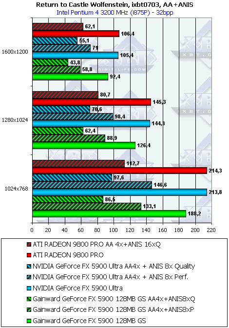• Return to Castle Wolfenstein (MultiPlayer) (id Software/Activision) — OpenGL, мультитекстурирование, ixbt0703-demo, настройки тестирования — все на максимально возможном уровне, S3TC OFF, конфигурации можно скачать тут