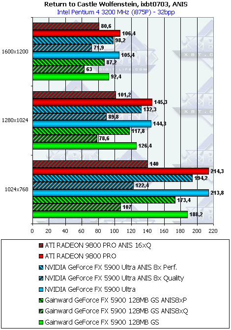 Тестирование на новой демке-бенчмарке показало, что FX 5900 держит верх только в режимах без АА и анизотропии, а также при включенной анизотропной фильтрации в режиме Performance. Впрочем, с учетом особенностей реализации анизотропии у RADEON 9800 PRO, мы можем вполне компромиссно сравнить максимальный уровень этой функции у продуктов ATI с аналогичной функцией у продуктов NVIDIA в режиме Performance (бывший Balanced).