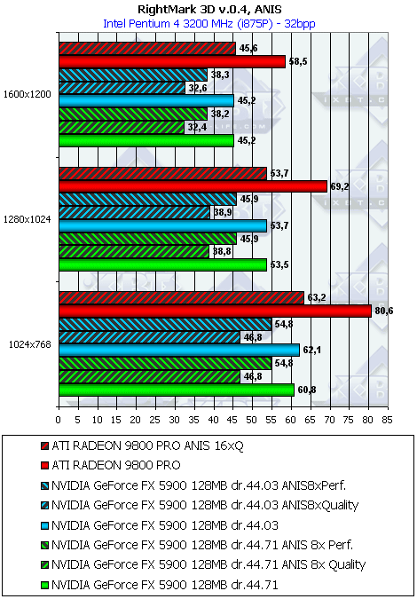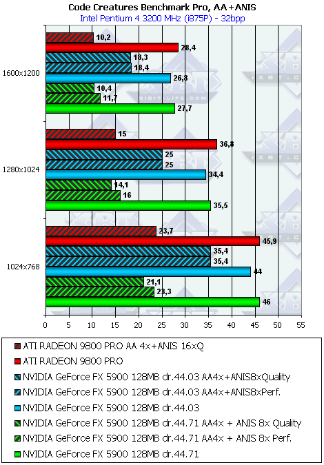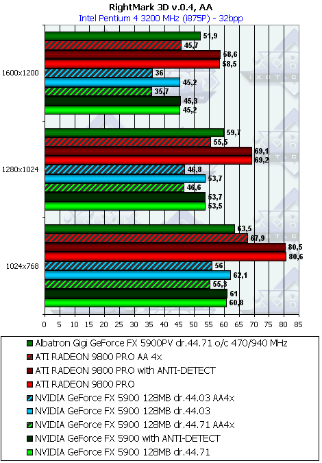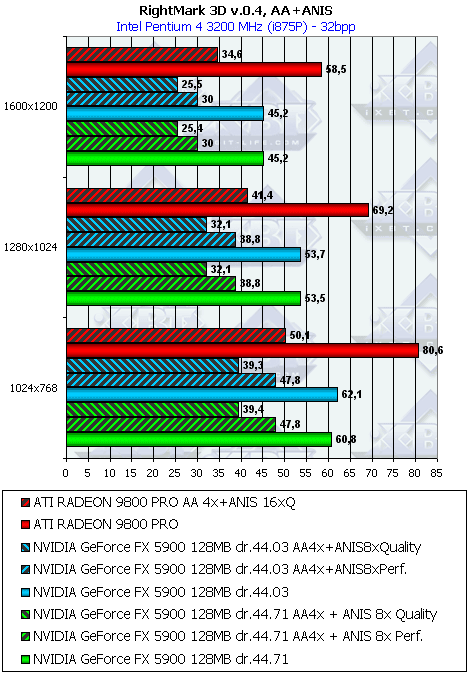 Как видим, разницы между версиями драйверов снова нет (кстати, напомню, что в 3DMark03 она есть, и капитальная. Это еще раз о том, что меряет 3DMark03). Что касается сравнения с RADEON 9800 PRO, то картина неоднозначная, в суммарном тяжелом режиме с АА и анизотропией performance FX5900 все же выигрывает. Однако в "легких" режимах проигрыш.