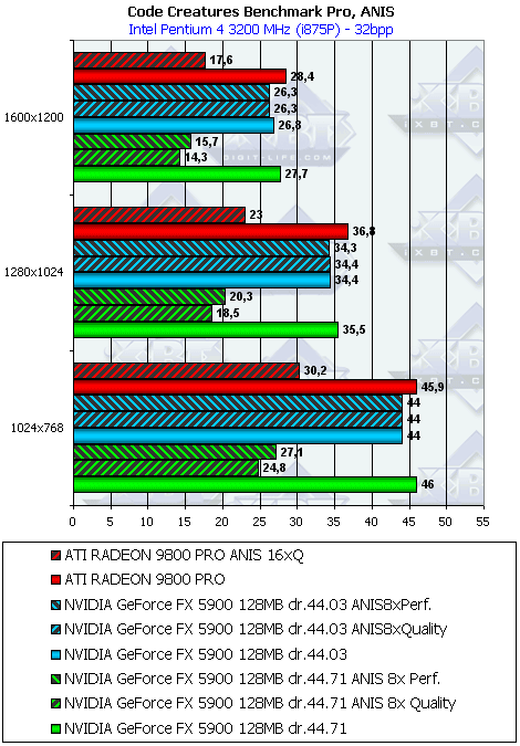 Что же доисравнения с RADEON 9800 PRO… Опять только режим АА с анизотропией Performance выручают детище NVIDIA. В остальных случаях проигрыш.