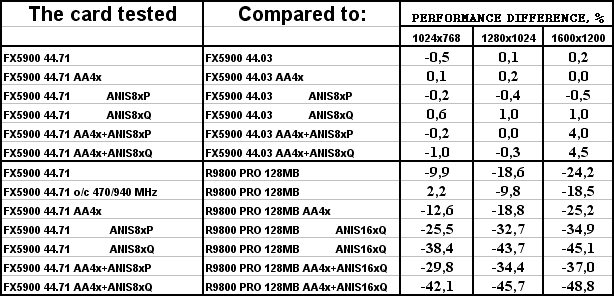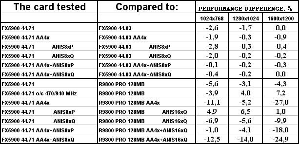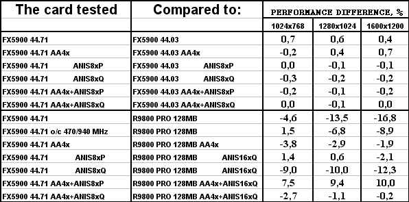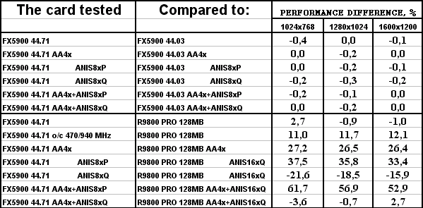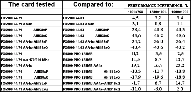 Разницы между версиями драйверов нет. И, увы, FX 5900 везде проиграл сопернику, и подчас с крупным счетом.
