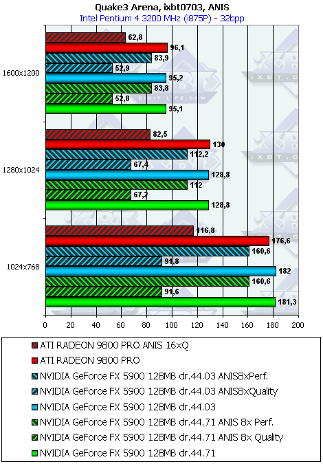 - Quake3 Arena v.1.17 (id Software/Activision) OpenGL, мультитекстурирование, ixbt0703-demo, настройки тестирования все на максимальном уровне: уровень детализации High, уровень детализации текстур №4, S3TC OFF, плавность кривых поверхностей резко увеличена при помощи переменных r_subdivisions «1» и r_lodCurveError «30000» (подчеркну, что по умолчанию r_lodCurveError «250» !), конфигурации можно скачать тут