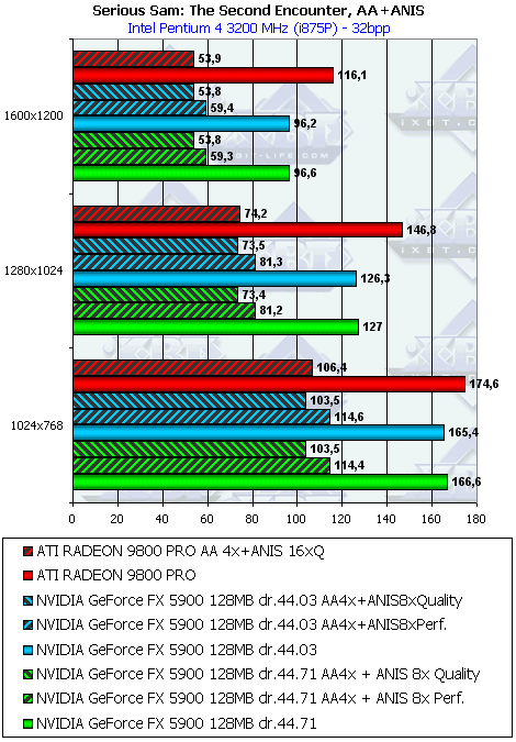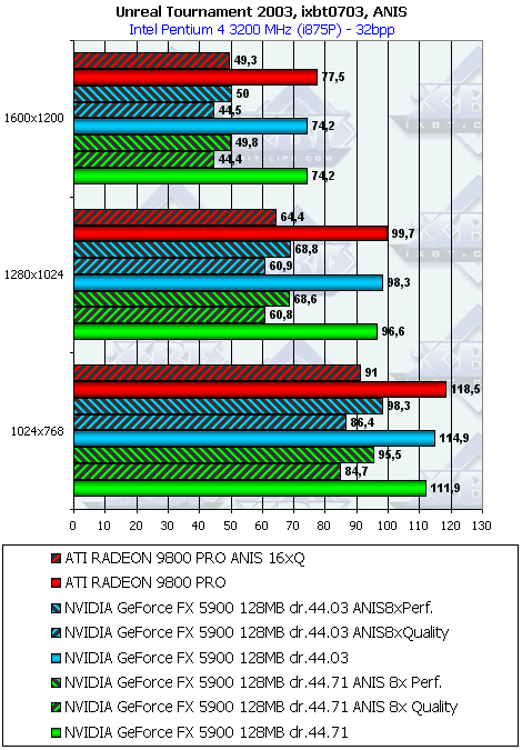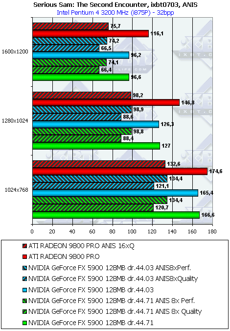 Разницы между версиями драйверов нет. Что касается соперничества с RADEON 9800 PRO, то в тяжелых режимах FX 5900 вырывает победу за счет более быстрого АА и анизотропии класса Performance (я повторю, почему мы сравниваем этот класс анизотропии у GeForce FX с Quality у RADEON 9800: в этом случае обе реализации функции имеют ряд упрощений, у ATI это понижение степени функции на ряде углов, у NVIDIA — упрощение трилинейки и самой анизотропии на дальних текстурах; поэтому по сумме плюсов и минусов можно признать их где-то равноправными, хотя мы приводим и сравнение Quality с Quality для тех, кто уверен, что "ущербную" в силу своих особенностей анизотропную фильтрацию у ATI совместно с полноценной трилинейкой надо сравнивать только с полноценной без упрощений анизотропией от NVIDIA).