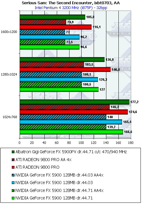 - Serious Sam: The Second Encounter v.1.05 (Croteam/GodGames) OpenGL, мультитекстурирование, ixbt0703-demo, настройки тестирования: quality, S3TC OFF