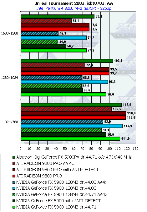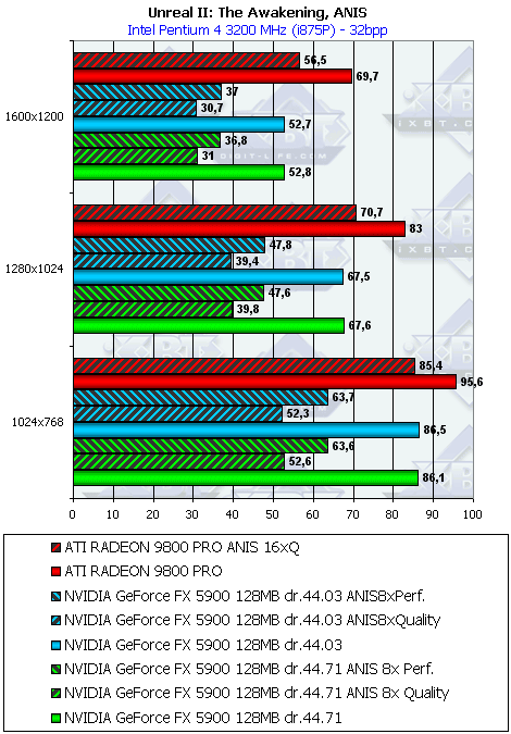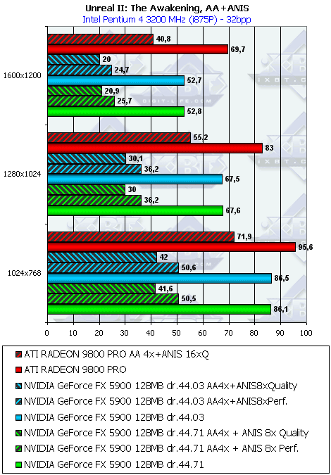 Хотелось бы отметить дальше, что почему-то не были обнаружены "заточки" под Unreal II. А ведь странно: игра вышла достаточно давно, пора бы давно оптимизации сделать и под нее, благо что движок у UT2003 и Unreal II один и тот же. Только почему-то под UT2003 были сделаны, по словам специалистов NVIDIA, "оптимизации", а под Unreal II — нет. Не является ли причиной этой разницы тот факт, что в Unreal II нет встроенного и открытого бенчмарка? А в UT2003 он есть. Читателям следует задуматься.