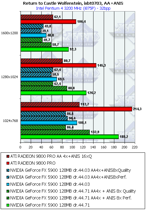 - Return to Castle Wolfenstein (MultiPlayer) (id Software/Activision) OpenGL, мультитекстурирование, ixbt0703-demo, настройки тестирования все на максимально возможном уровне, S3TC OFF, конфигурации можно скачать тут