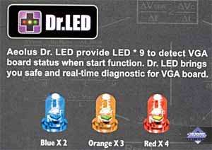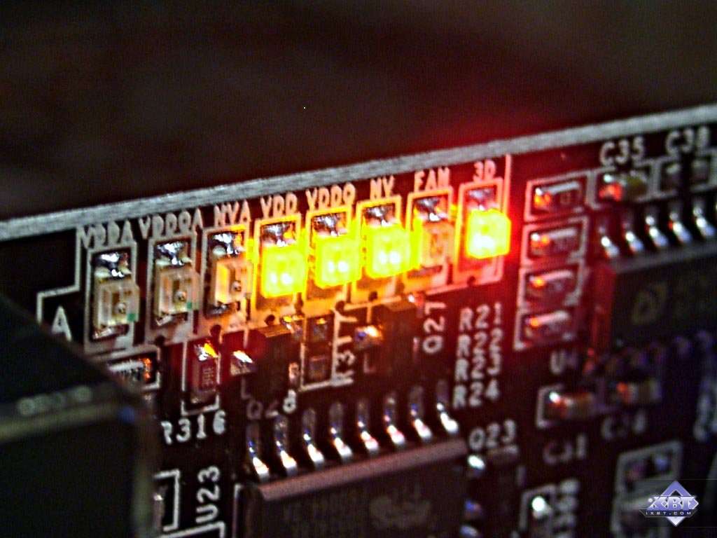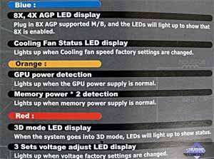 Это индикаторы состояния карты. При помощи светодиодов можно узнать о состоянии напряжений ядра и памяти (не выходят ли они за пределы нормы), режиме работы AGP, самой карты (2D/3D), а также в случае изменений каких-либо параметров работы карты (например, частоты вращения кулера) отличных от штатных, вас известят об этом светодиоды.
