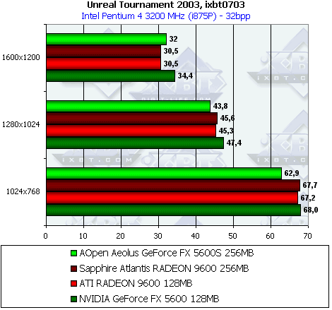 А здесь RADEON 9600 уже вышел в лидеры, и лишь в 1600х1200 (при почти уже неиграбельных скоростях) FX 5600 стал первым.