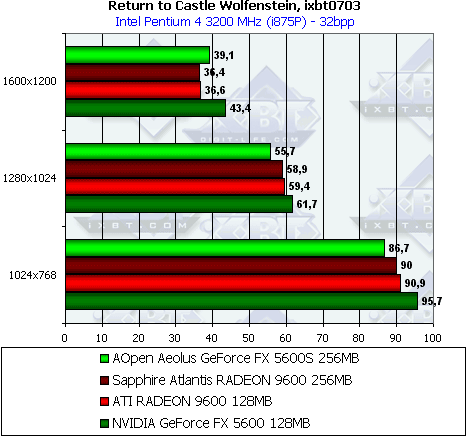 - Return to Castle Wolfenstein (MultiPlayer) (id Software/Activision) OpenGL, мультитекстурирование, ixbt0703-demo, настройки тестирования все на максимально возможном уровне, S3TC OFF, конфигурации можно скачать тут