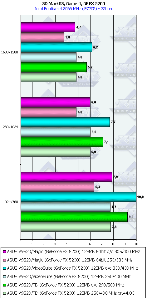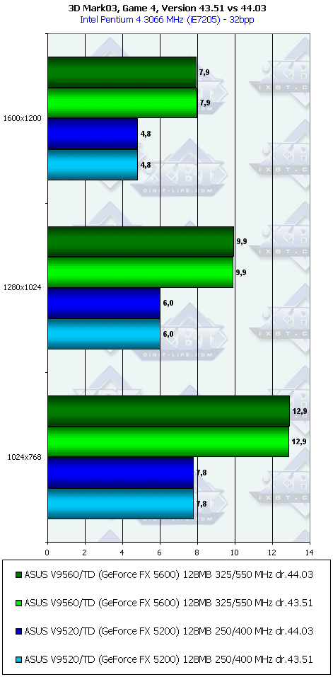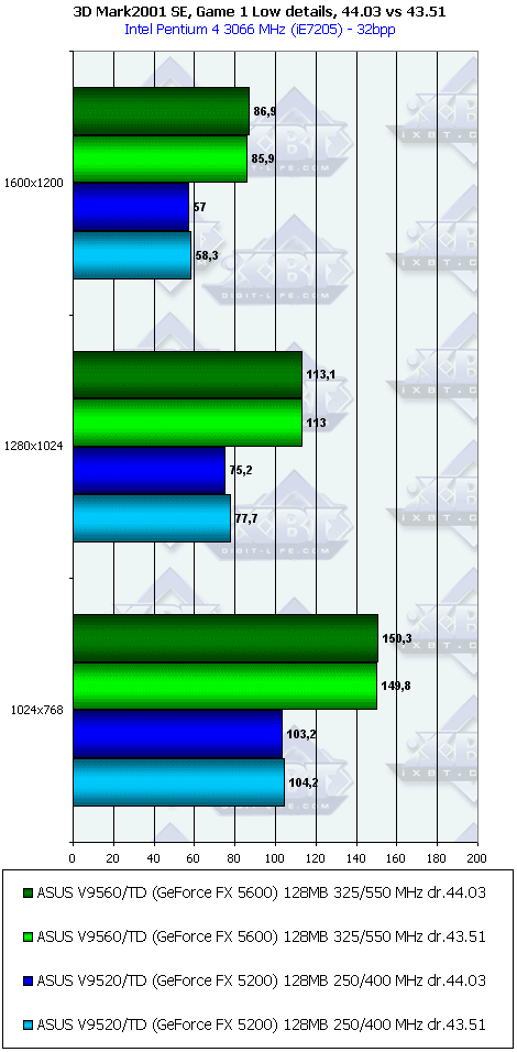 Подводя итоги, можно констатировать, что NVIDIA еще надо много работать и работать над драйверами, чтобы поднять скорость работы у GeForce FX 5200 и 5600, особенного у первого. Либо весьма сильно снижать цены, ибо при нынешних запросах денежных эквивалентов все новинки от NVIDIA (в исполнении ASUS) выглядят весьма скромно.