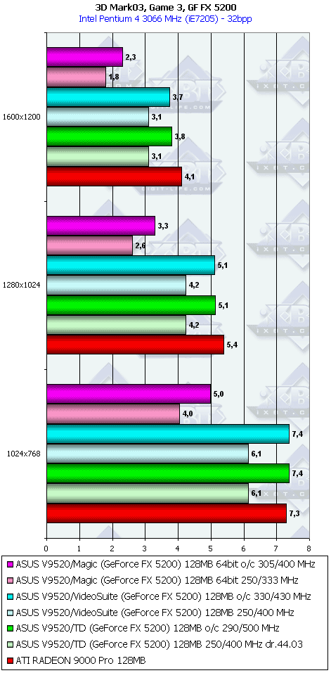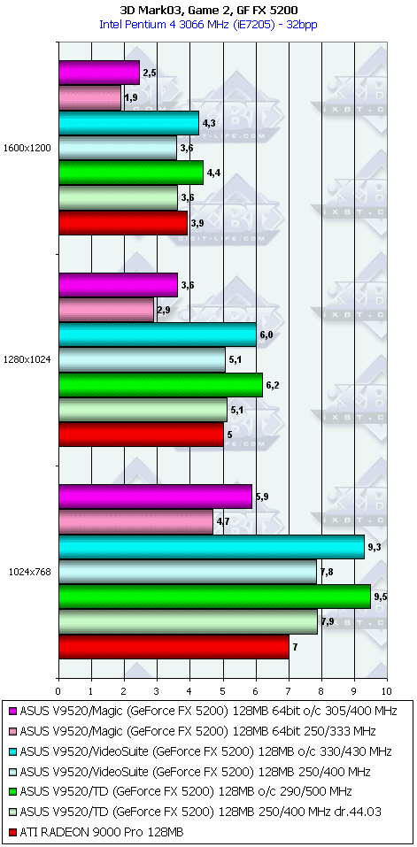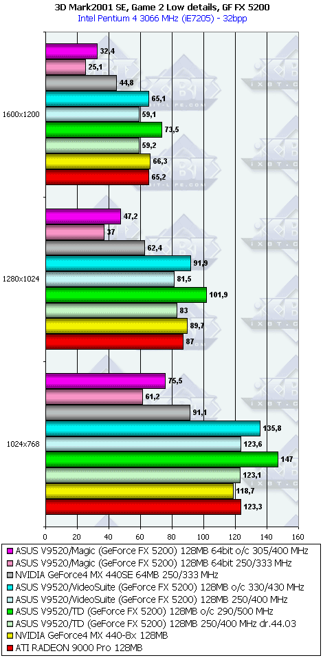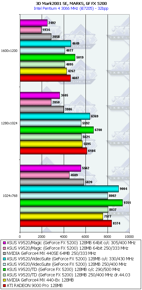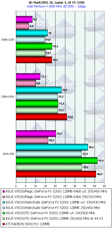 У 5200 картина несколько отраднее, однако только засчет того, что RADEON 9000 PRO не поддерживает DirectX 9.0.