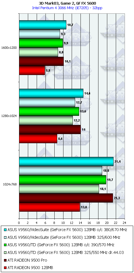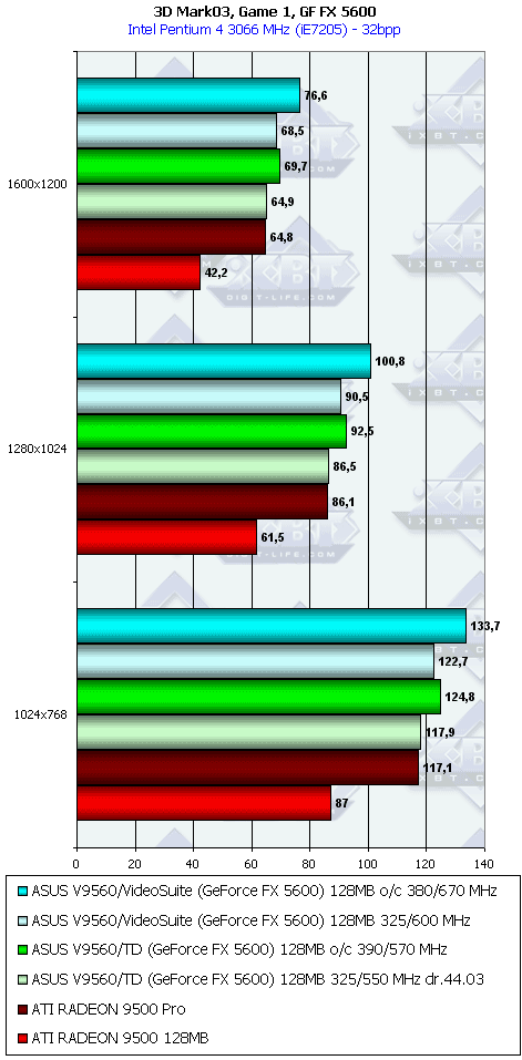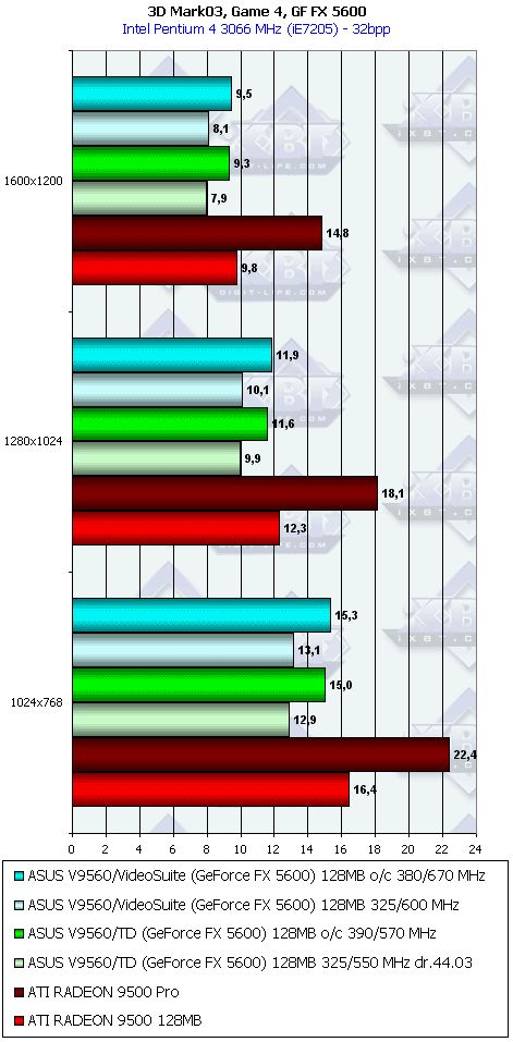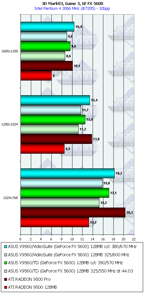 - ASUS V9560/VideoSuite 128MB эта карта будет еще более привлекательной даже против RADEON 9500 PRO, учитывая наличие VIVO, аппаратного мониторинга состояния и повышенных частот работы памяти;