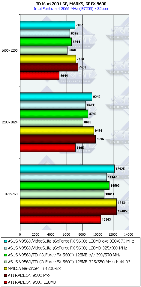 Пока мы видим проигрыш со стороны GeForce FX 5200 как MX440-8x, так и RADEON 9000 PRO. 64-битная карта не смогла противостоять даже MX440SE. А вот 5600 выглядят получше. Да, конечно, цены пока завышены, и потому карты ныне дороже даже RADEON 9500 PRO, однако им есть куда падать по цене, в отличие от последнего.