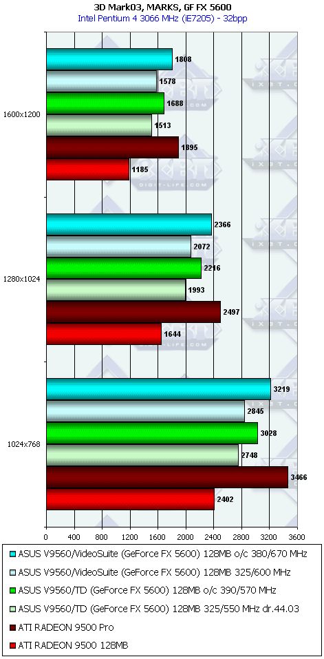 Снова примерное равенство с конкурентами у 5200 (128бит). А GF FX 5600 как были между RADEON 9500 и 9500 PRO,
