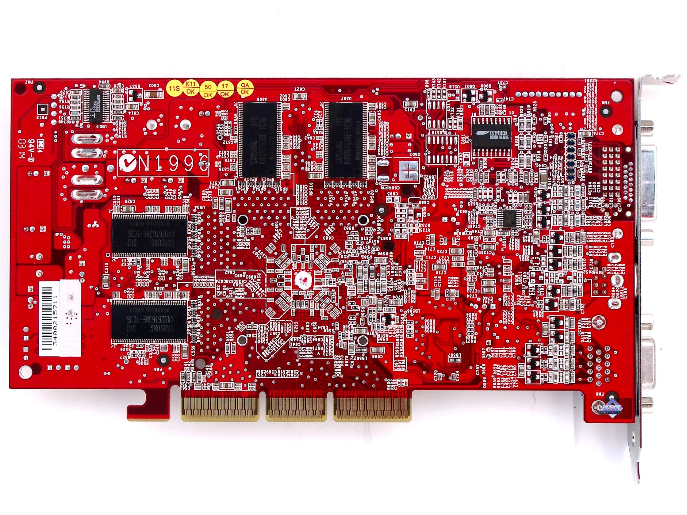 | Микросхемы памяти производства Samsung. Время выборки у микросхем памяти 5ns, что соответствует частоте работы 200 (500) МГц, на которой память и работает. Частота работы GPU стандартные 250 MHz. | ![]() |