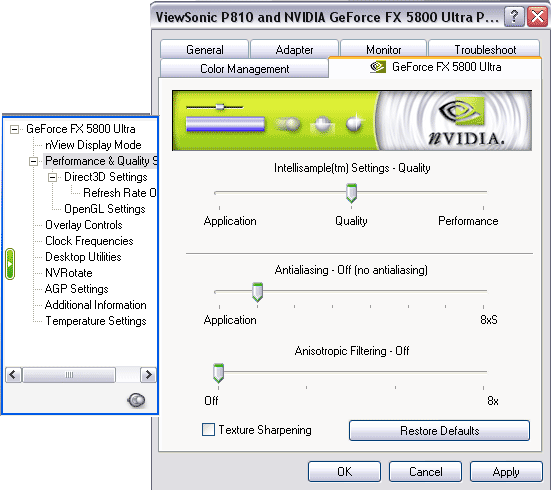 Настройки работы АА и анизотропии вынесены на одну закладку и работают одновременно и в OpenGL, и в Direct3D. Среди новшеств видим режимы АА - 6xS и 8xS. Позже мы рассмотрим их более подробно.