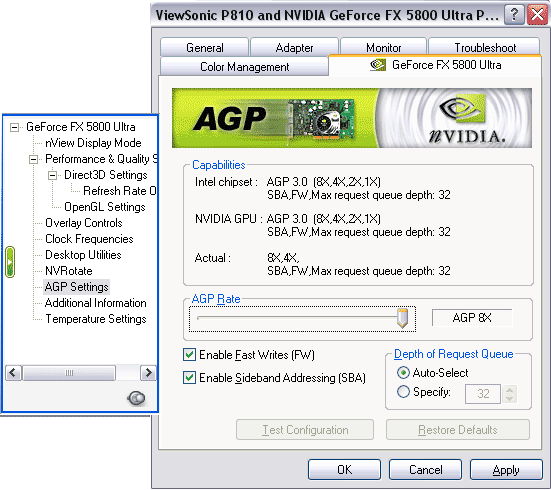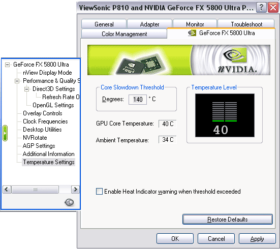 Далее идет выбор режима работы AGP и последняя интересная закладка - это аппаратный мониторинг температурного режима работы карты. Интересно, что в некоторых версиях драйверов можно увидеть не только температуру самого чипа, но и температуру карты. Вероятно, программисты еще работают над окончательным видом этой страницы.
