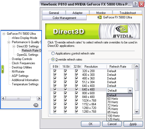 Настройки Direct3D и OpenGL стандартны и уже привычны многим пользователям видеокарт на базе процессоров от NVIDIA. Обратим внимание на то, что в разделе D3D есть возможность принудительно форсировать частоту смены кадров в том или ином разрешении.
