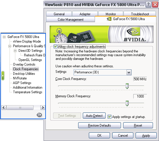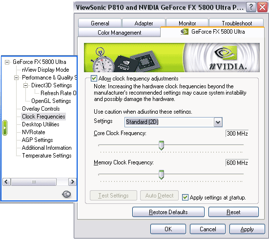 Теперь самый интересный раздел - тактовые частоты. Получить доступ к этой закладке (а также к некоторым другим) можно, запустив патч к registry Windows XP. Так вот, мы видим, что частоты работы карты разделены на 2D и 3D. По умолчанию в 2D плата работает на частотах 300/300 (600) МГц, а в 3D, как и ожидалось, 500/500 (1000) МГц. Интересно отметить, что принудительный подъем частоты работы в 2D до 500/500 (1000) не вызывает увеличения оборотов кулера. Впрочем, после перезагрузки режим работы в 2D (300/300 (600)) восстанавливается, невзирая на установленную галочку использования заданных частот при перезагрузке Windows.