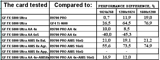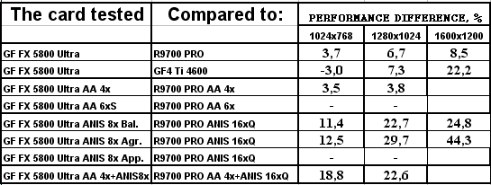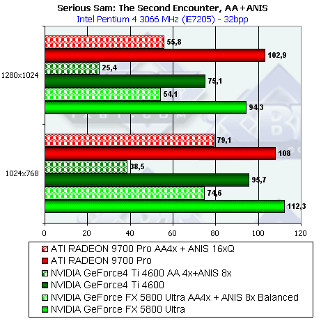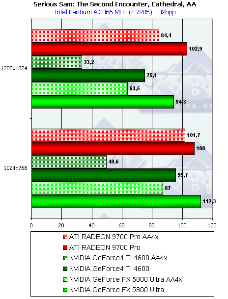 А здесь картина обратная. Если без нагрузки худо-бедно NV30 выиграл сражение, то потери в АА привели карту к полному поражению в тяжелых режимах.