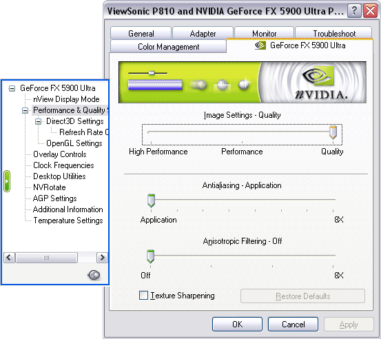 Мы видим, что предустановки режимов IntelliSample снова изменились: теперь это Quality (прежде это ApplicATIon), Performance (бывший режим Balanced), High Performance (ранее Aggressive или просто Performance). Добавился режим АА 8х (не 8xS только для D3D, а работающий и в D3D, и в OGL).