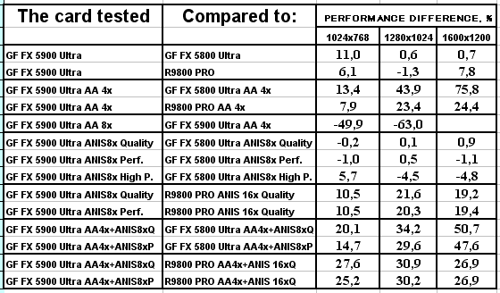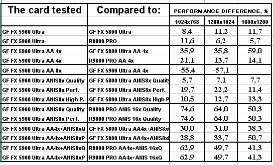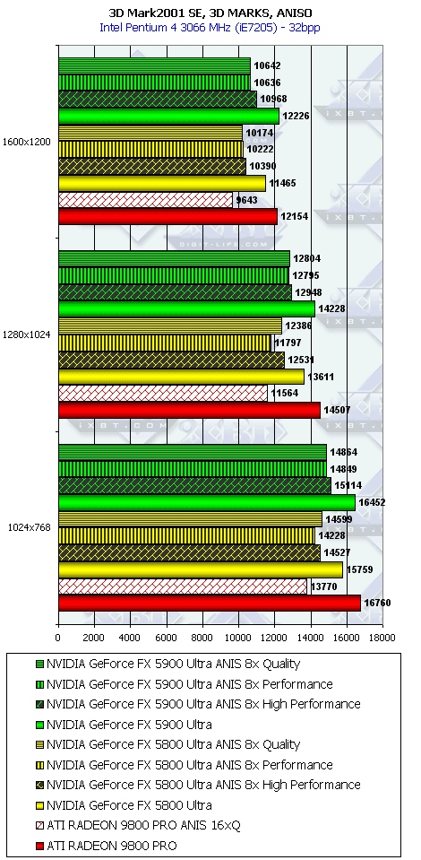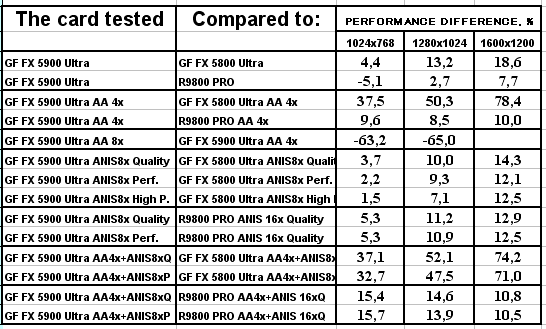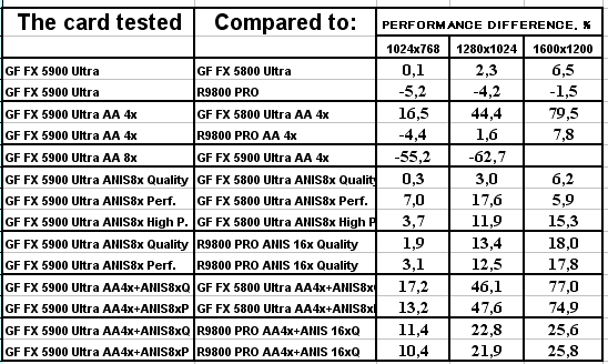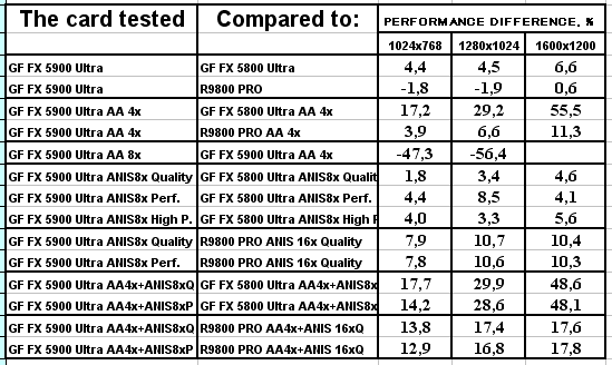 Сразу отмечу, почему мы использовали в наших тестах настройки анизотропии 16х у карт от ATI и 8х у карт от NVIDIA. Никакой дискриминации в отношении карт от ATI нет! Алгоритмы работы этой функции у ATI и NVIDIA очень различаются (об этом мы говорили подробно в нашем материале по NV30), поэтому сопоставлять только цифры "8" неразумно. Критерий один: максимально возможное качество. У NVIDIA по ее "счетчику" это 8х, а у ATI 16х. Скриншоты мы уже приводили, и не один раз. К тому же, интересно будет узнать, как сопоставляются разные режимы работы анизотропии от NVIDIA с максимально качественным режимом от ATI, тем более, что опять же, скриншоты мы уже приводили, и читатель может оценить соотношение скорости и качества (милости просим в обзор NV30 за скриншотами оценки качества анизотропной фильтрации).