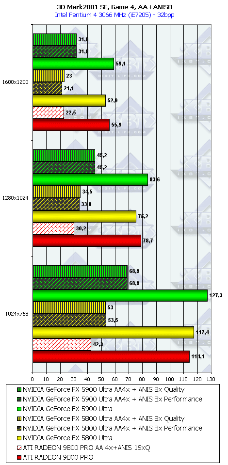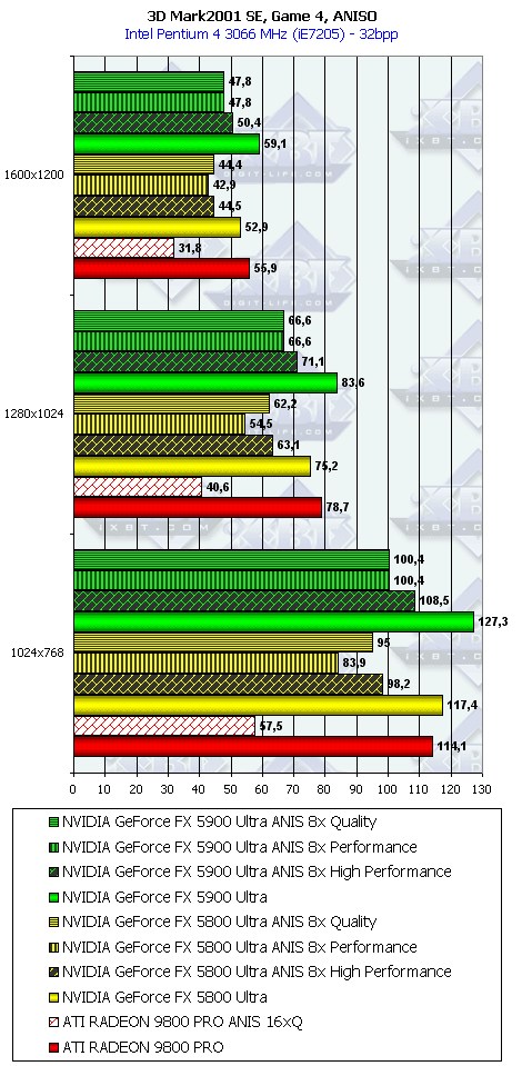 (256 / 8 * 850) / (128 / 8 * 1000) = 27200 / 16000 = 1.7 раза. Это же сильно помогло карте выиграть и в комплексных тяжелых режимах с АА и анизотропией. И это все, несмотря на уменьшившиеся частоты работы как самого процессора (450 против 500 МГц), так и памяти (425 против 500 МГц). - Алгоритм анизотропии не претерпел изменений, однако, как мы видим, программисты NVIDIA усиленно работают над оптимизациями этой функции (более подробно о подобном в OpenGL можно прочитать в статье Алексея Николайчука AKA Unwinder). Причем, работа идет в целом по семейству GeForce FX, а не только по NV35, поэтому мы видим, что на последней версии 44.03 скорости анизотропии у NV30 и NV35 иногда почти равны. Интересно отметить, что специфика анизотропии от NVIDIA такова, что почти вся нагрузка ложится на чип, и поэтому логично было бы ждать более низких результатов у NV35 из-за более низкой частоты работы GPU, однако все же процессор оптимизировали и с точки зрения скорости выполнения этой функции.