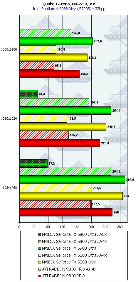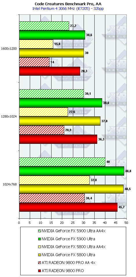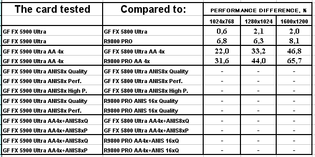Ну что можно сказать? Почти сбываются обещания NVIDIA обогнать RADEON 9800 PRO в режимах с АА и анизотропией на 50-80%. Так оно и есть! 256-битная шина очень помогает NV35 добиться успеха в АА. Да и анизотропия весьма хороша: посмотрите, частоты ниже, а скорость выше (я про сравнение NV35 и NV30). Снова вспоминаем материал Алексея Николайчука.
