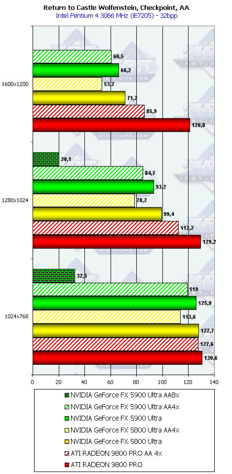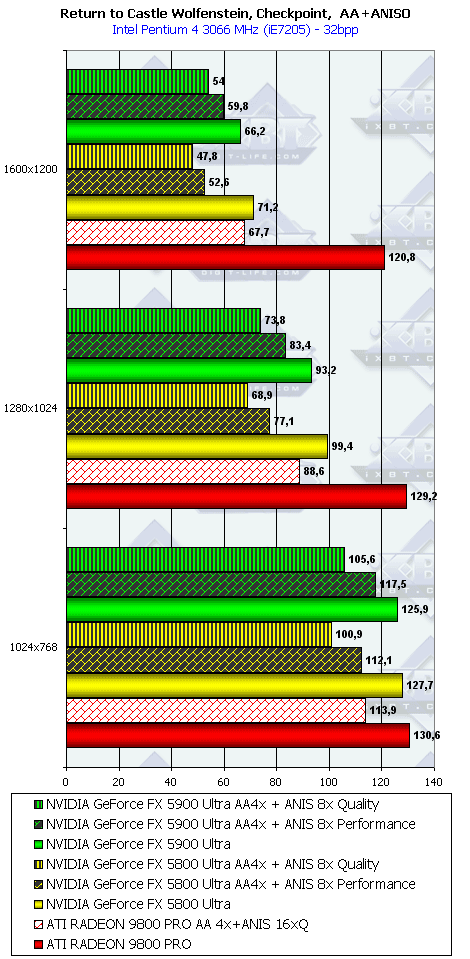 Ну а насчет этого теста вообще трудно что-либо сказать. После драйверов версии 42.82 вдруг случился резкий провал по скорости в данной игре еще у NV30. И до сих пор программисты NVIDIA не предприняли никаких мер по восстановлению справедливости! А ведь NV30 могла в 1600х1200 выдавать более 120 fps! А сейчас около 70! Это не 8-10 fps разница! Очевидно, что как NV30, так и NV35 работают неправильно в этой игре, драйвер неверно формирует архитектуру рендеринга у столь гибко настраиваемого процессора. Странно и то, что данная игра выпущена на базе движка Quake3 при участии непосредственно самой id Software, под продукты которой программисты NVIDIA давно уже оптимизируют драйверы. В общем, пока фиксируем поражение NVIDIA в этом тесте.