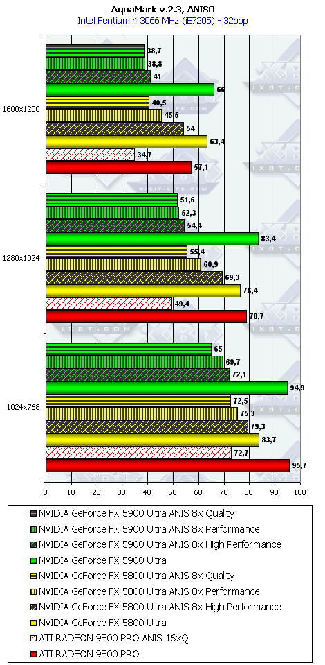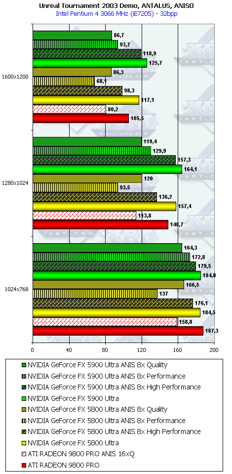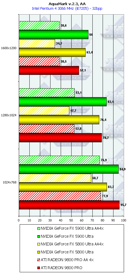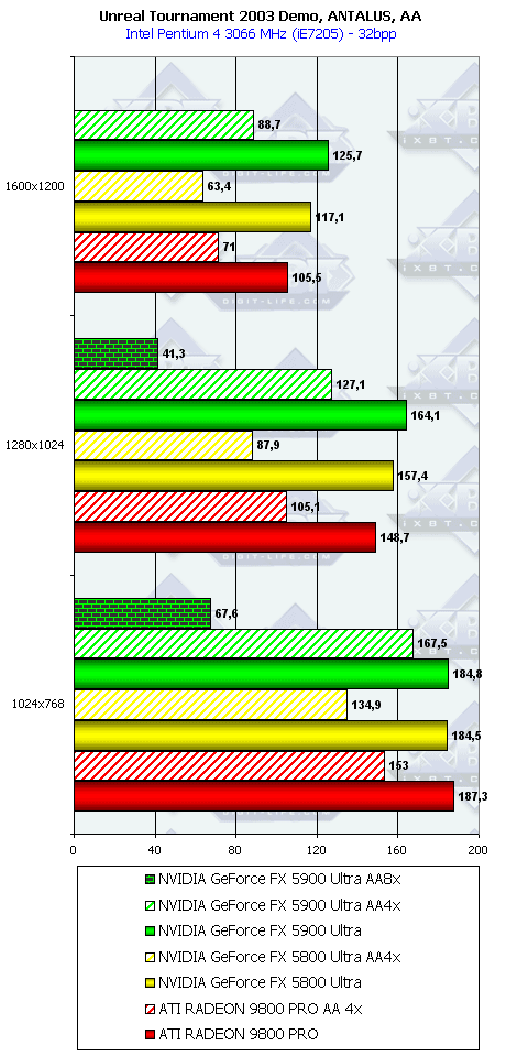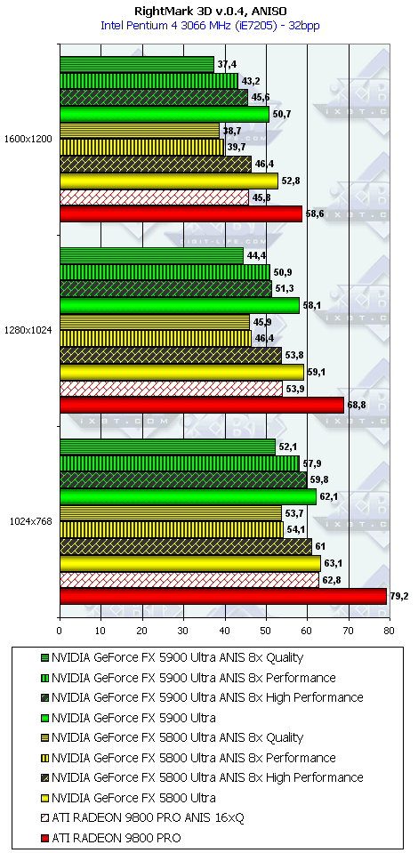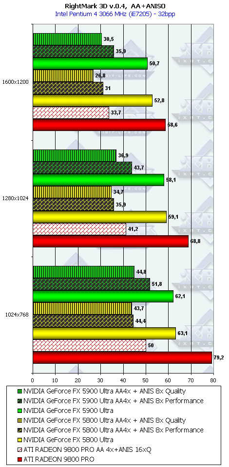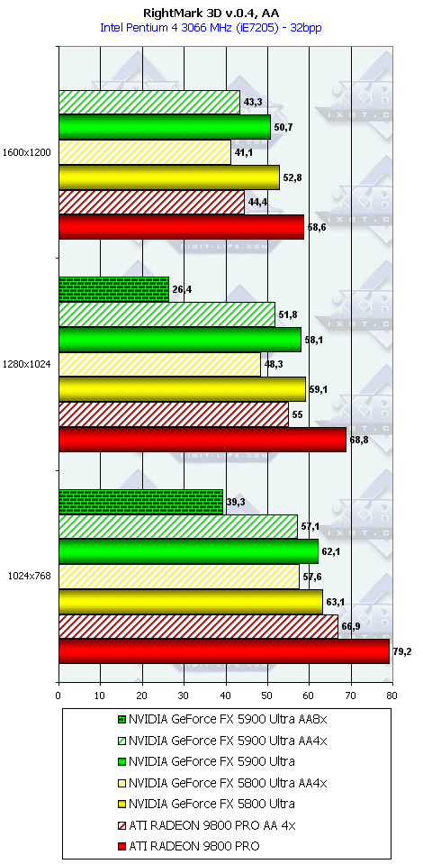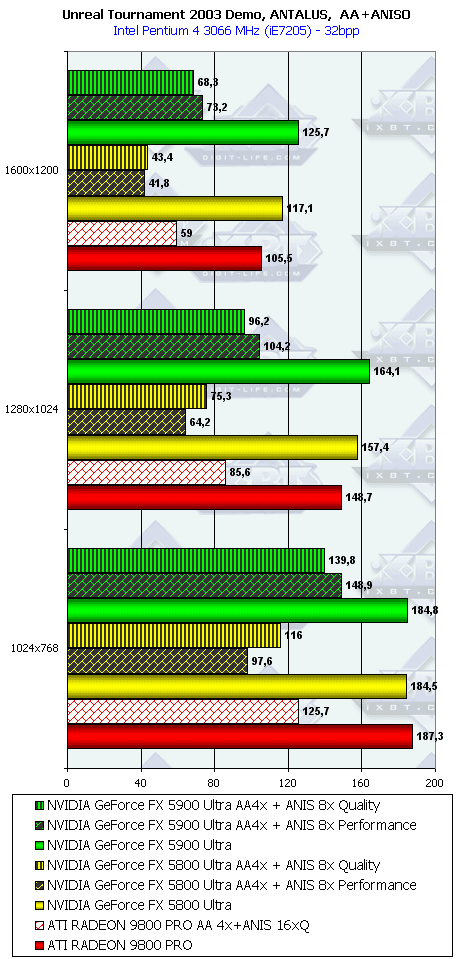 Как ни странно, но в данном тесте случился провал у NV35 с анизотропией даже относительно NV30 (по всей видимости, драйверы не были оптимизированы под данный тест), а превосходство с АА не столь велико, поэтому суммарное преимущество NV35 в комплексном тесте очень мало.
