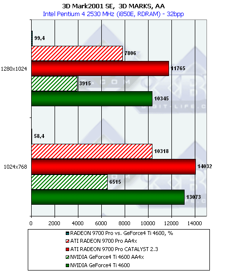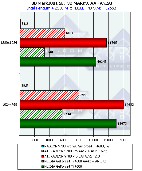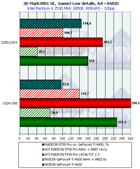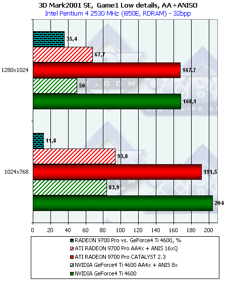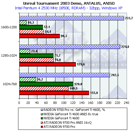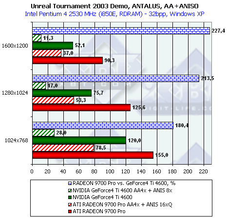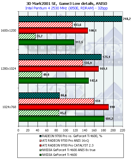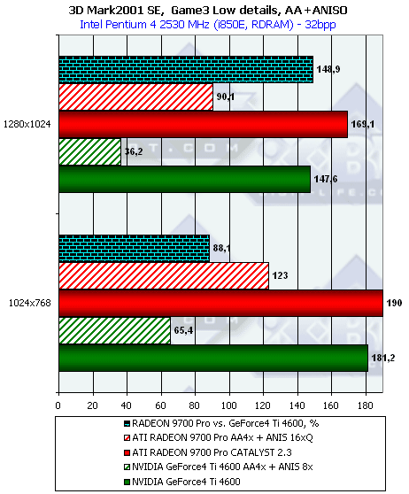 Как мы видим, при тестировании без нагрузок АА и/или анизотропии новый драйвер от ATI никаких отличий в плане производительности для RADEON 9700 не принес. Тем не менее, приросты относительно скорости GeForce4 Ti 4600 при активизации этих функций поражают воображение.