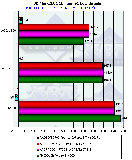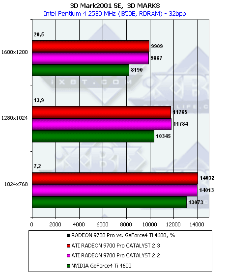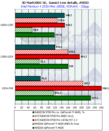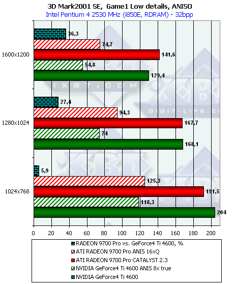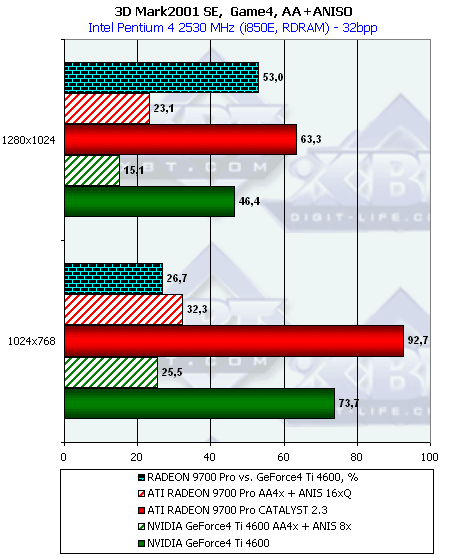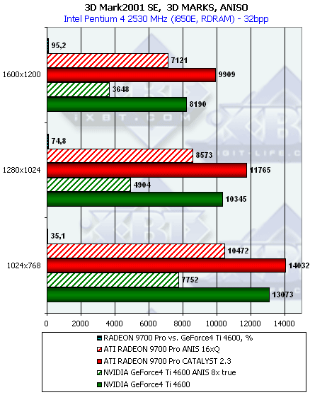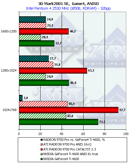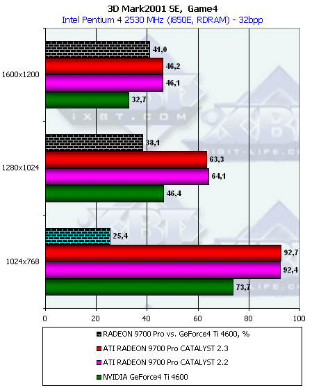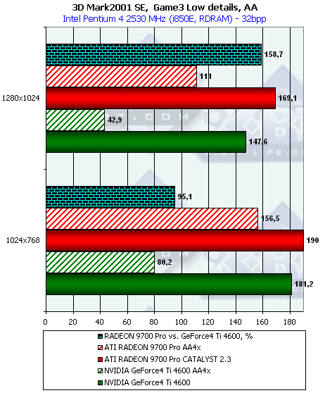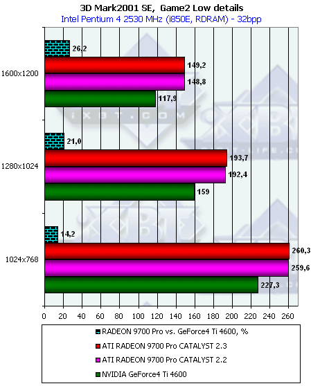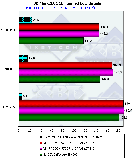 - Превосходство RADEON 9700 над Ti 4600 осталось на прежнем уровне, то есть производительность RADEON 9700 совершенно не изменилась на новом CATALYST 2.3 и при дополнительной нагрузке;